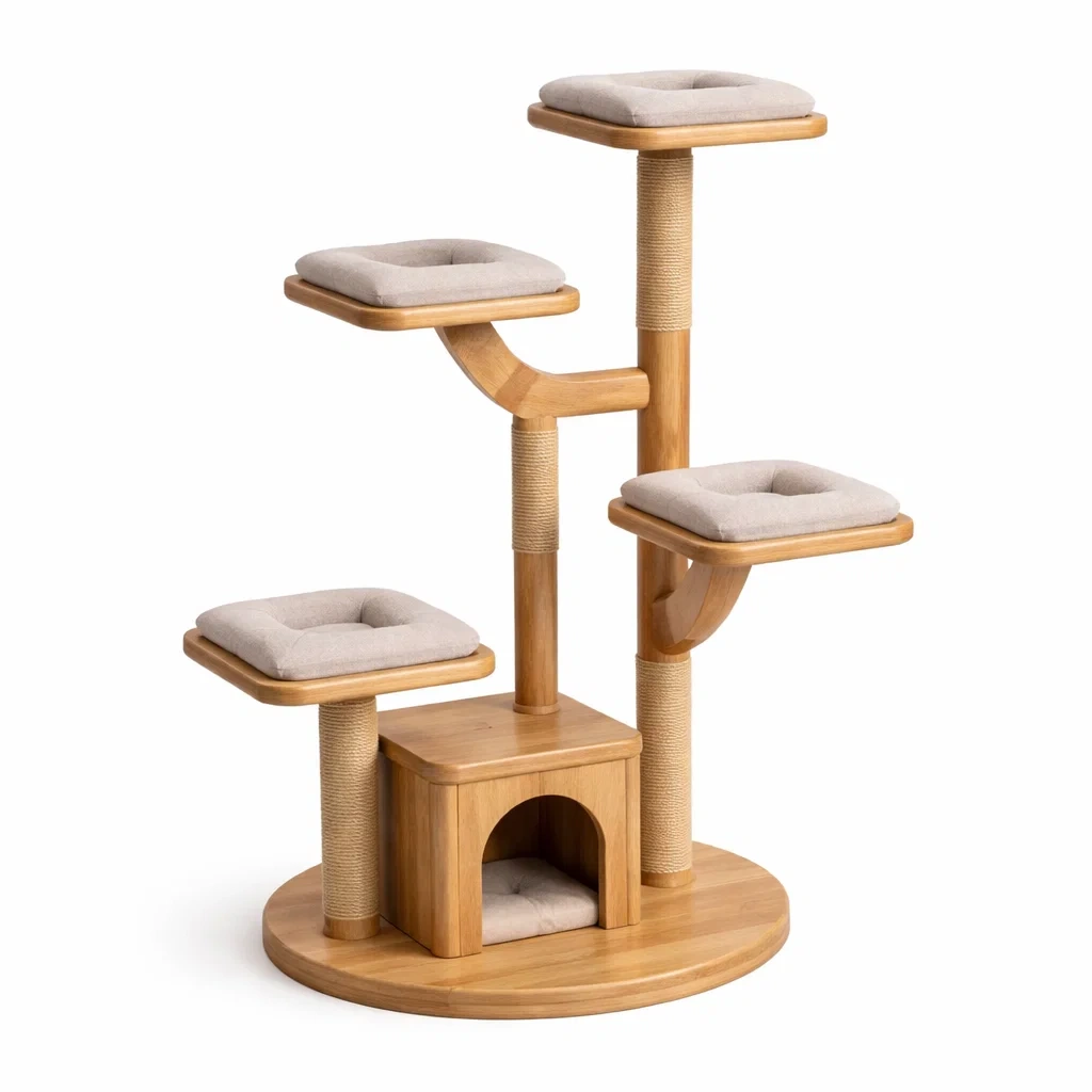 Conception structure à plusieurs niveaux avec plateformes rembourrées. Quatre plateformes, poteaux recouverts de sisal pour griffes, niche inférieure.